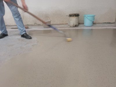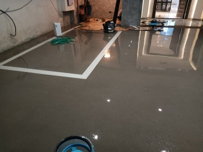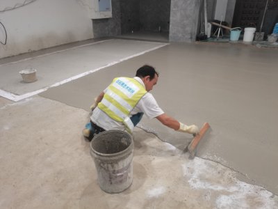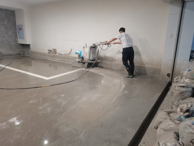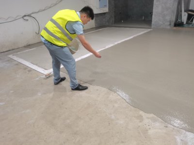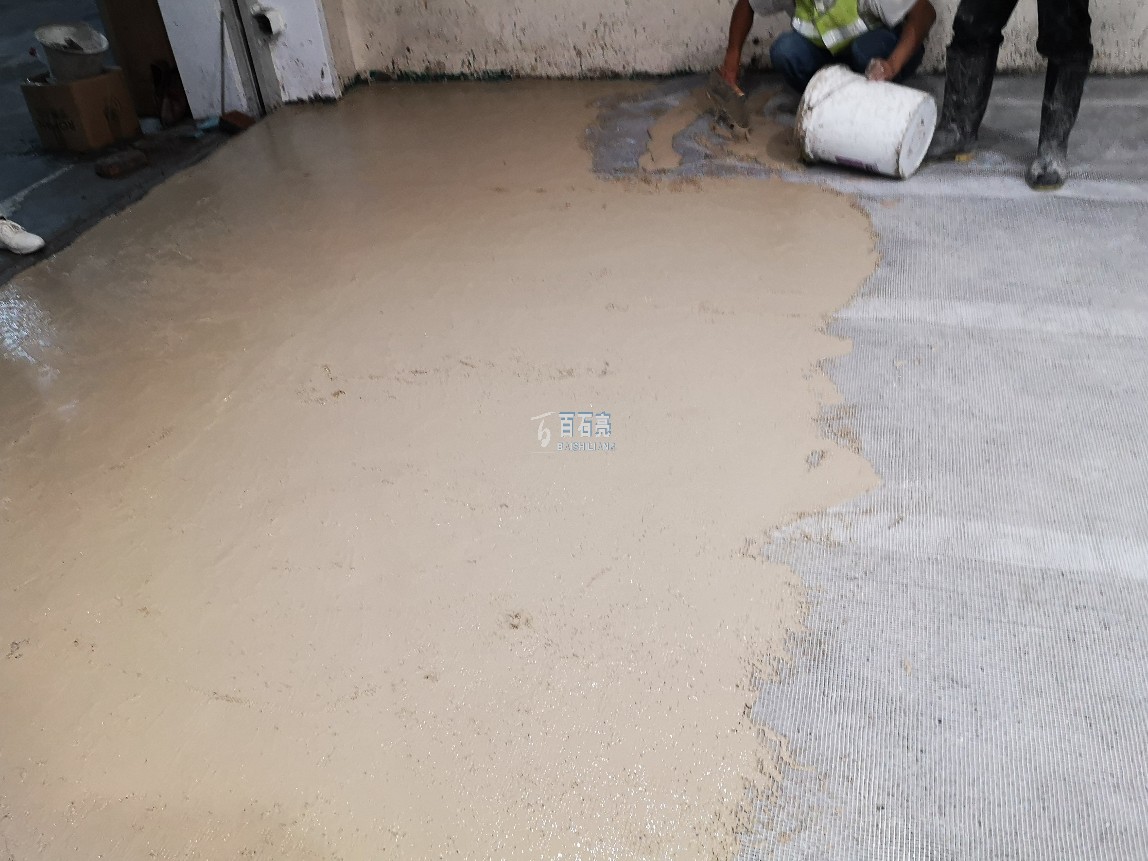 鋪設(shè)玻釬網(wǎng)、鋪設(shè)界面層,將界面砂漿與水?dāng)嚢杌旌暇鶆?,然后將材料倒在地面上,均勻批刮用量?2mm左右(混泥土平整度和強(qiáng)度.天氣溫度直接影響到界面材料用量浮動 0.1 屬于正常范圍),滾筒涂刷時,要求方向一致、輕重恰當(dāng),刷紋均勻,無遺漏。(如有遺漏及不飽滿將會產(chǎn)生抹光機(jī)絞砂和空鼓現(xiàn)象)。