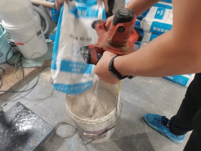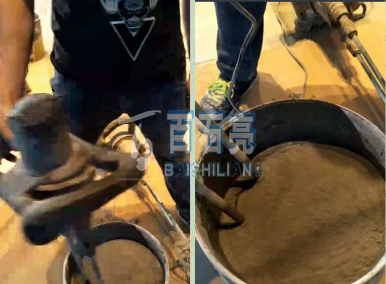 魔石干粉砂漿應(yīng)用專用的攪拌設(shè)備進(jìn)行攪拌,攪拌時依據(jù)產(chǎn)品說明按照嚴(yán)格的水灰比,先將計(jì)算好的水加入容器中,開動攪拌機(jī)器的同時加入魔石砂漿,在攪拌器內(nèi)充分?jǐn)嚢?。攪拌時間不少于 3分鐘,靜漿1分鐘,再攪拌1分鐘,且不得因攪拌過度而產(chǎn)生變色。攪拌至無結(jié)塊,同時要觀測其流動性以確保濃度。由于加水量過多會導(dǎo)致降低強(qiáng)度,因此不能隨意增加水量。