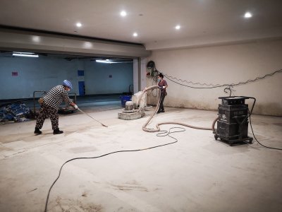 粗磨時應(yīng)配合 2m 靠尺對打磨的地坪進(jìn)行平整度檢測,將偏高部位磨至平整度達(dá)標(biāo)為準(zhǔn),粗磨應(yīng)磨出所有骨材紋理,粗磨平整度控制在 2 米 1 毫米為準(zhǔn)。50-150目的金剛石磨片開面打磨,使地面更平整、光滑(干磨)
