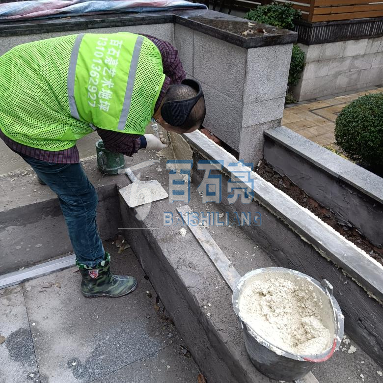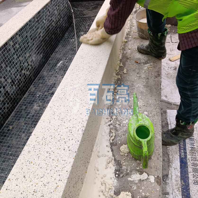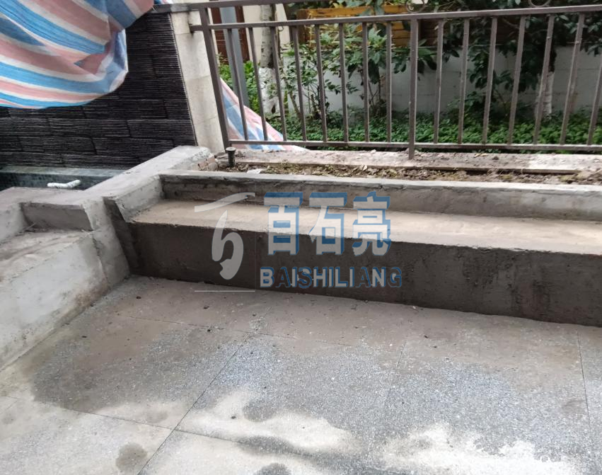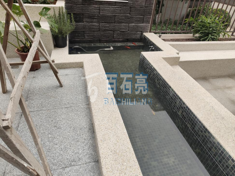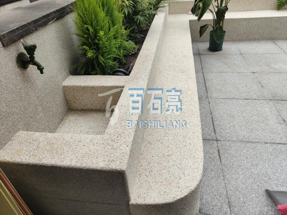 - 渝北壹江郡花園水磨石 這是一款由白色水泥加白色骨料 均勻混合而成的水磨石 用在花園地面 光滑又平整 清新自然 攤鋪 將混合均勻的水磨石材料攤鋪在地面上厚度1.5-2公分。 使用靠尺...