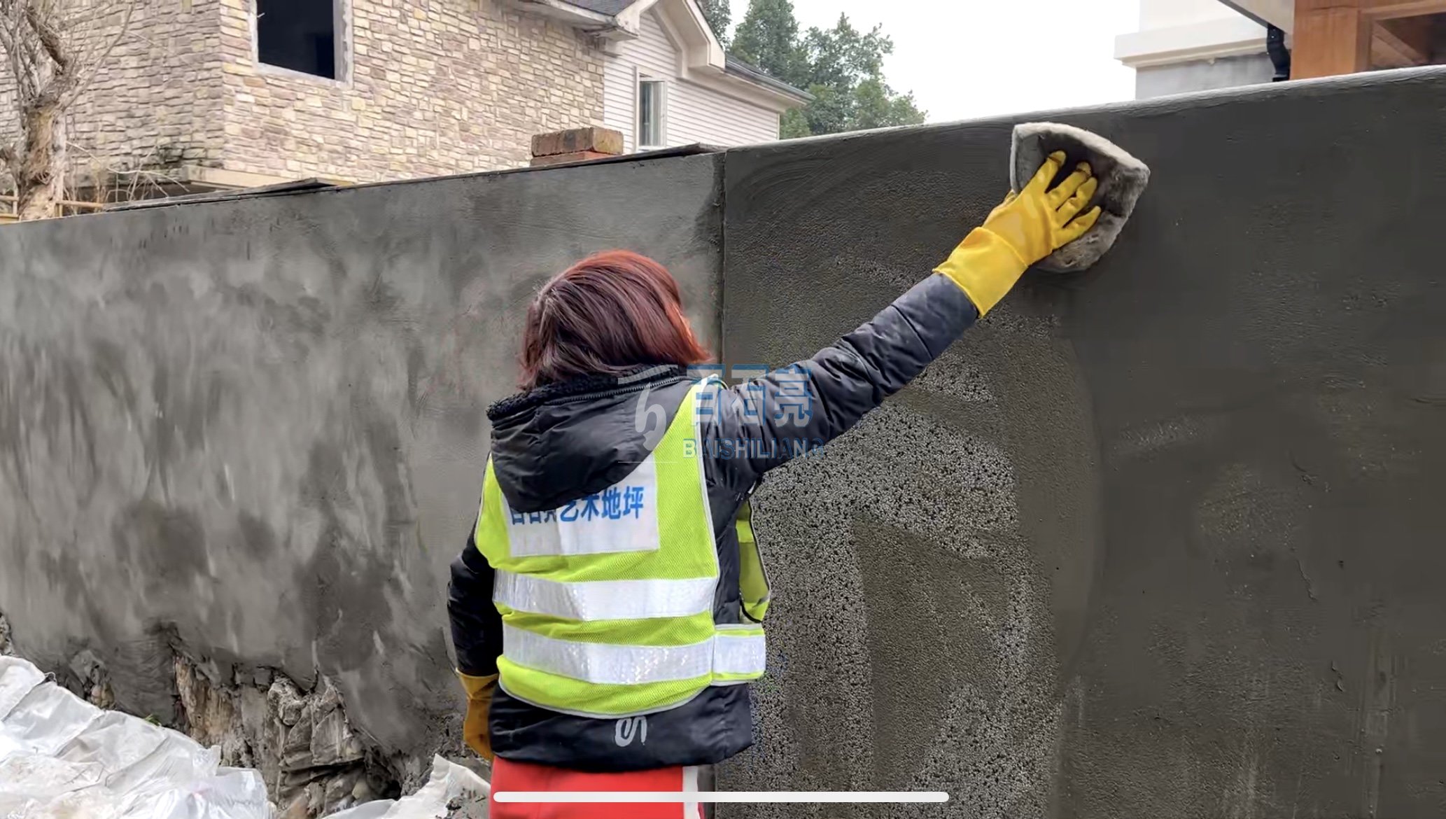 這位客戶選用灰黑色系的水洗石,主要組成由大小不一的灰黑色石子加灰色的水洗石母料,這樣的搭配,做出來的墻面,簡約又耐臟,平整度高,并且整體無縫,效果很好,跟別墅整體風格很搭。