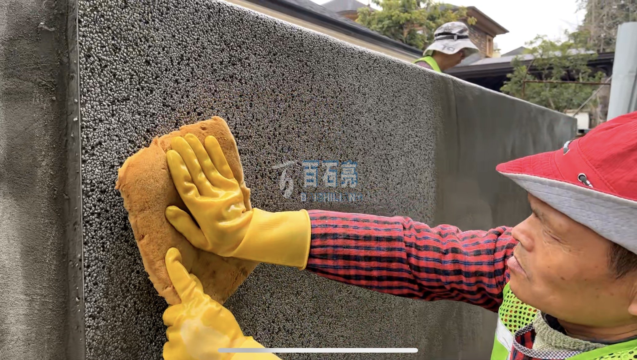 將大概晾兩小時后的水洗石,用柔軟的海綿擦洗表面的水泥漿,直到露出均勻的小石子