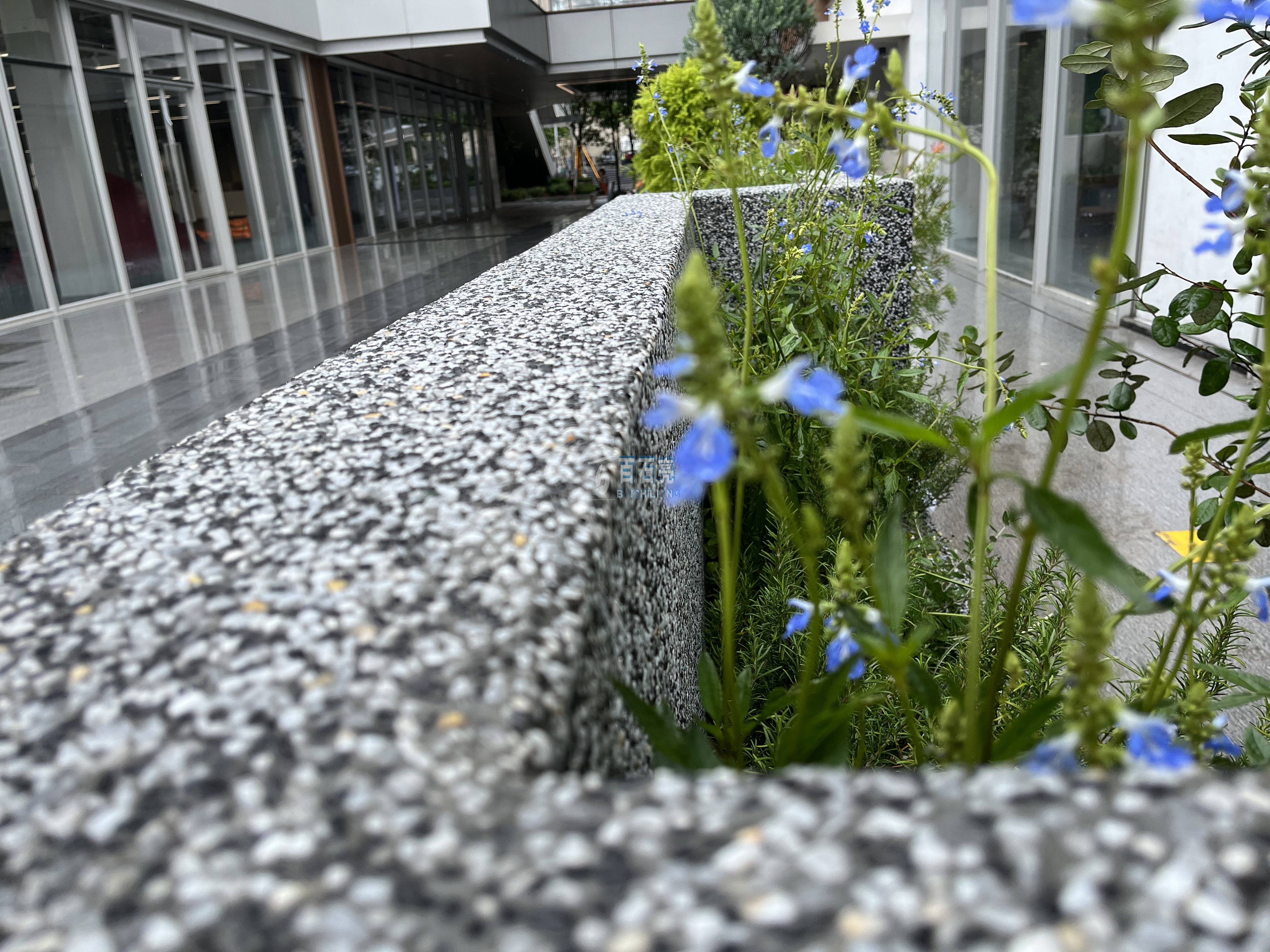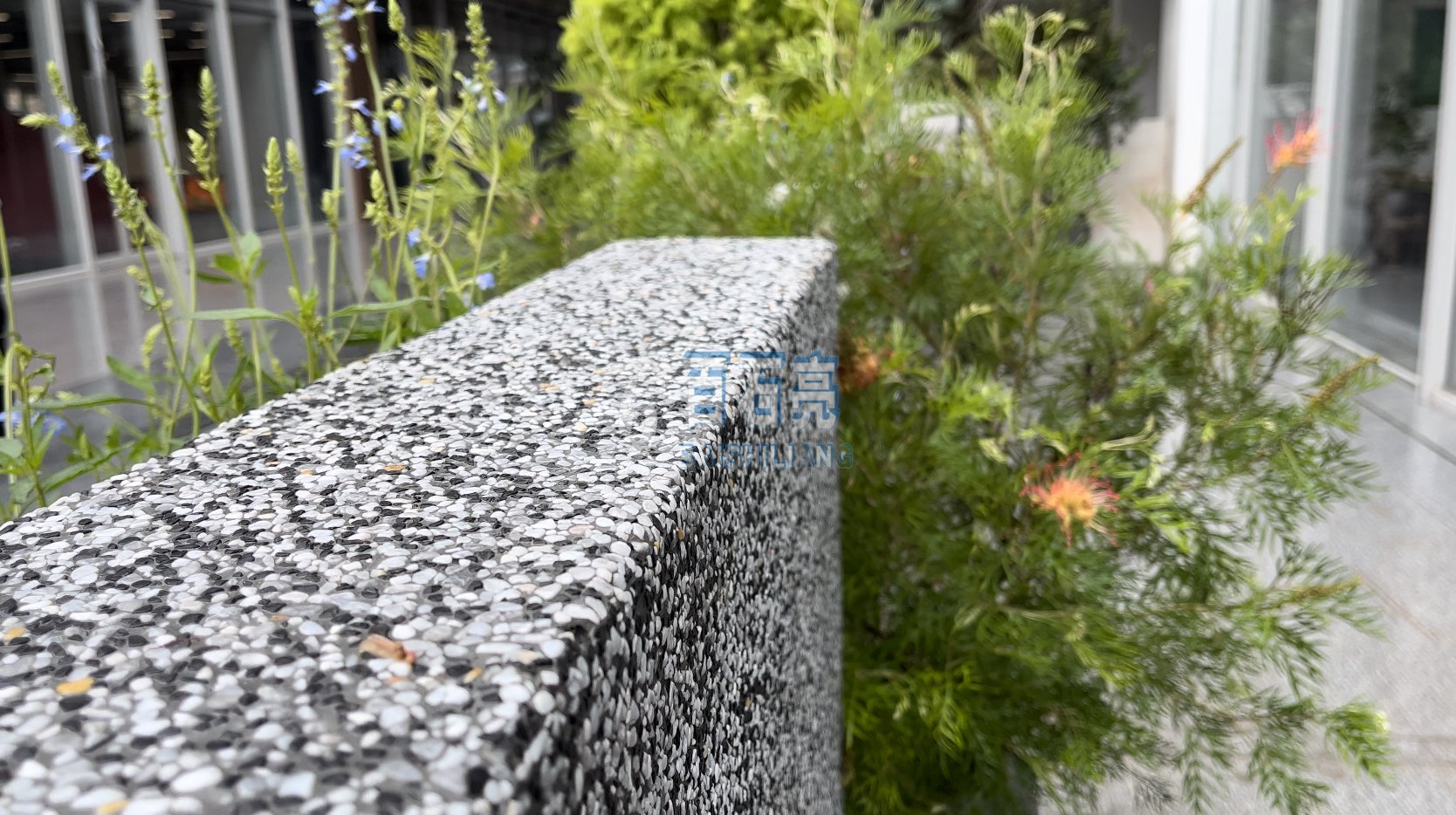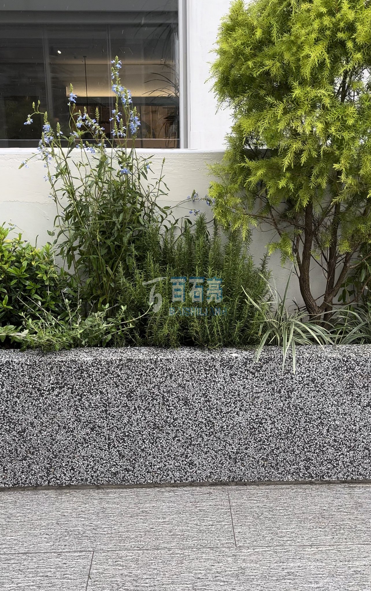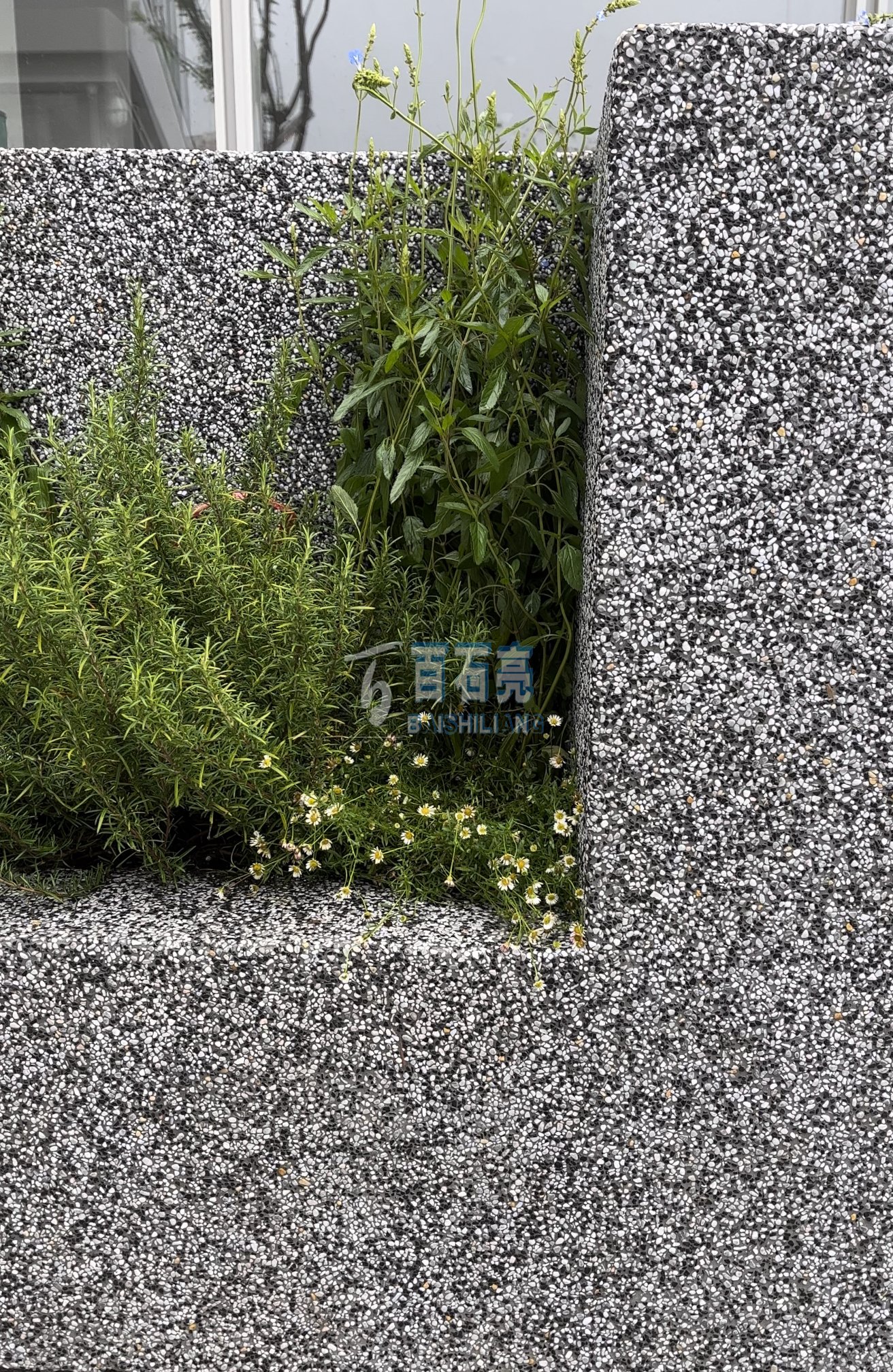 是一家餐廳戶外小花園。主要的施工范圍是水洗石花池還有墻面。