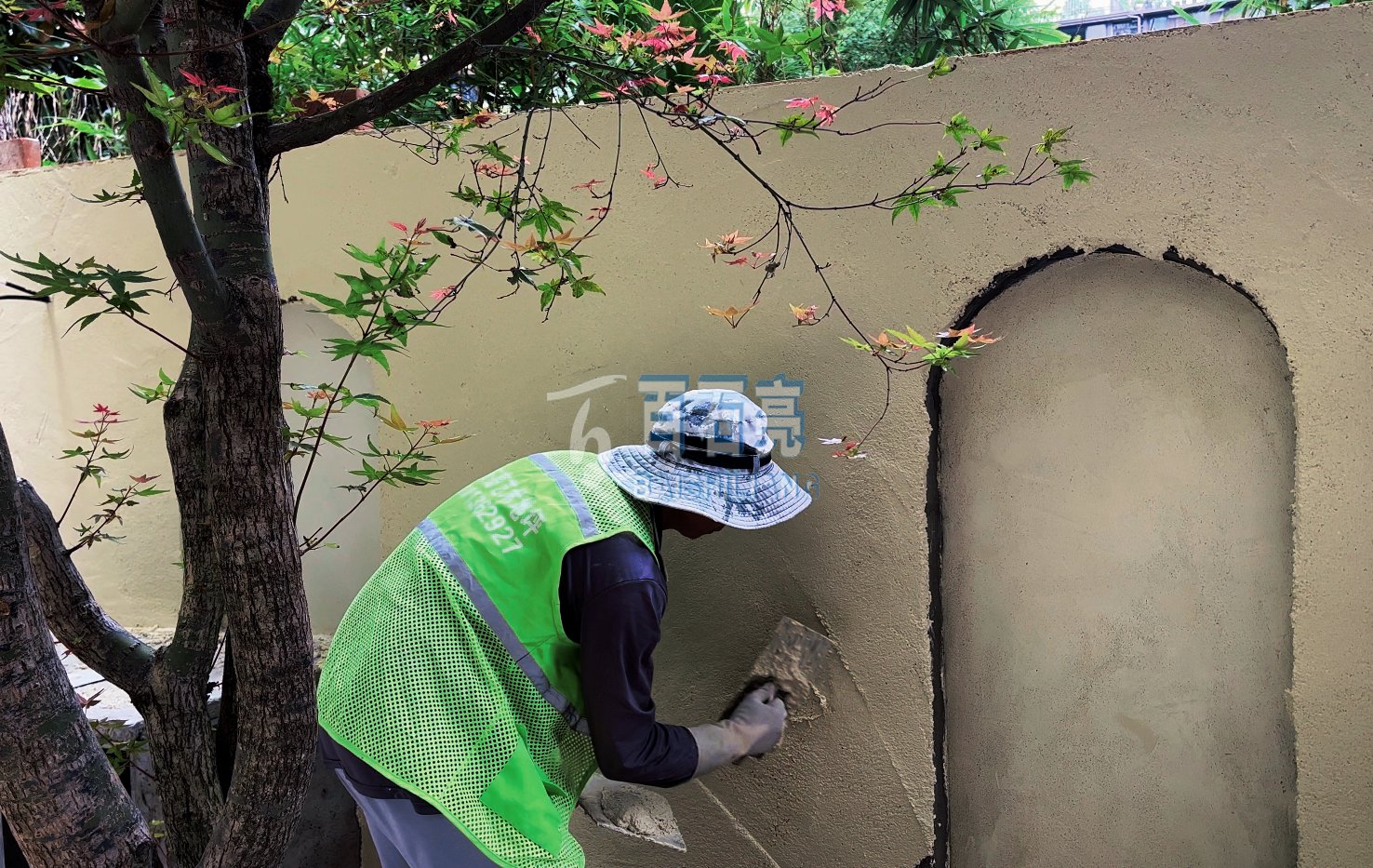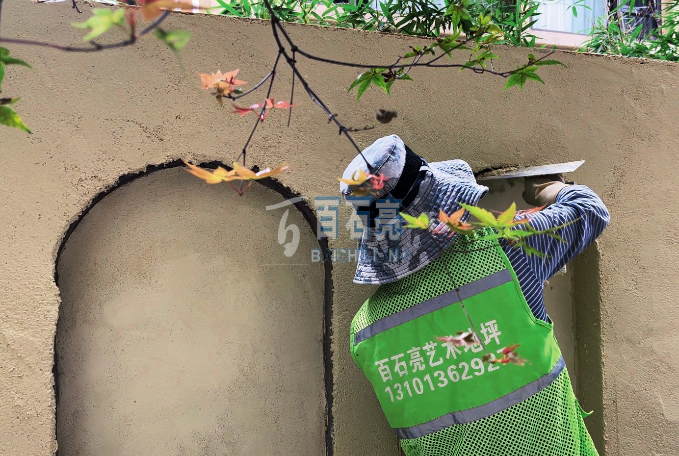 首先是墻面水磨石的攤鋪工作,墻面攤鋪是有一定難度的,況且客戶還做了幾個(gè)拱形的設(shè)計(jì)。