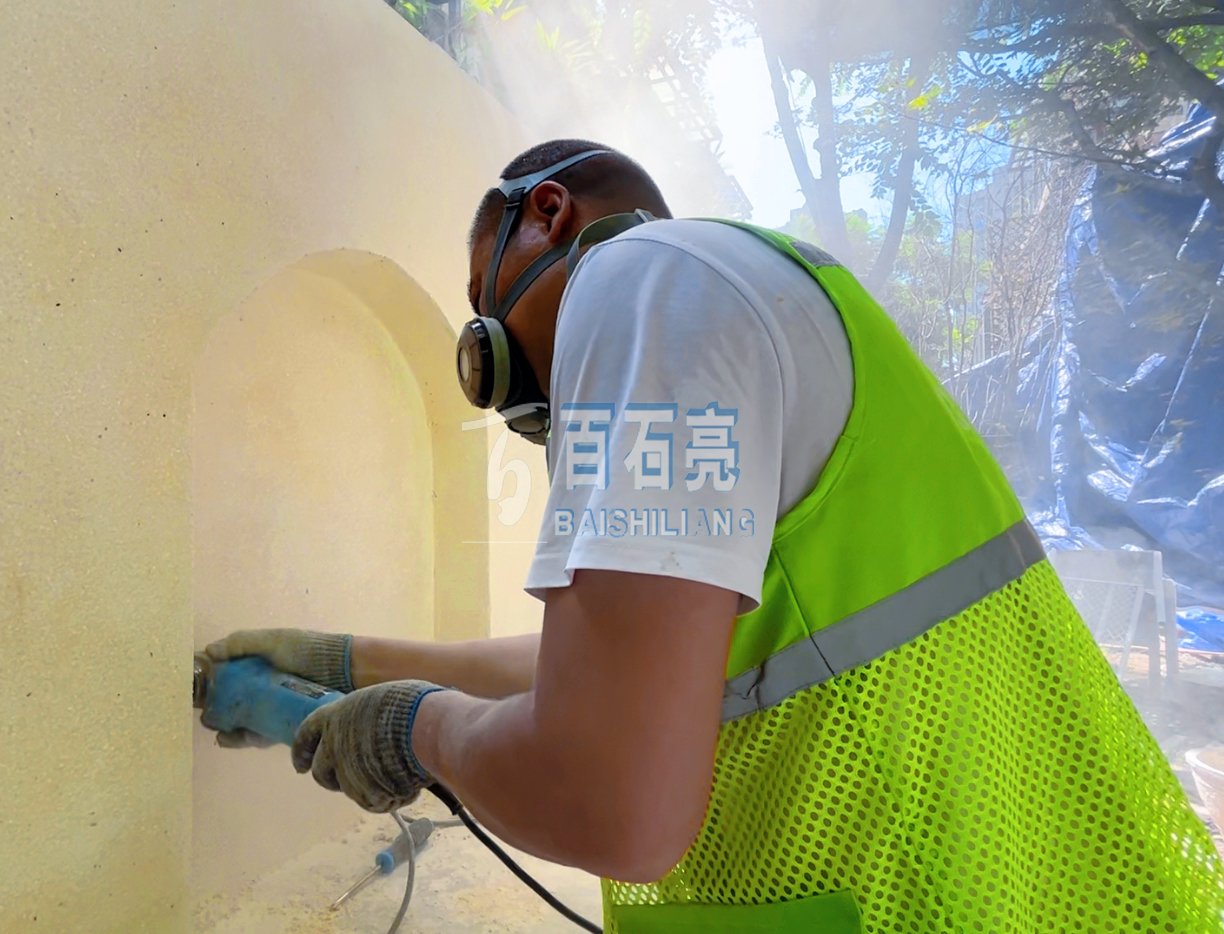 攤鋪好之后就可以開(kāi)始打磨工序。我們使用的是專(zhuān)業(yè)的墻面打磨設(shè)備墻面水磨石打磨,只能手動(dòng)用手磨機(jī)小面積打磨??梢杂行У厝コナ砻娴哪p和裂紋,每個(gè)細(xì)節(jié)的地方都可以反復(fù)的打磨到。然后在進(jìn)行補(bǔ)漿工作。用多余水磨石余料來(lái)填補(bǔ)縫隙和蜂窩眼讓墻面更加光滑和整潔。