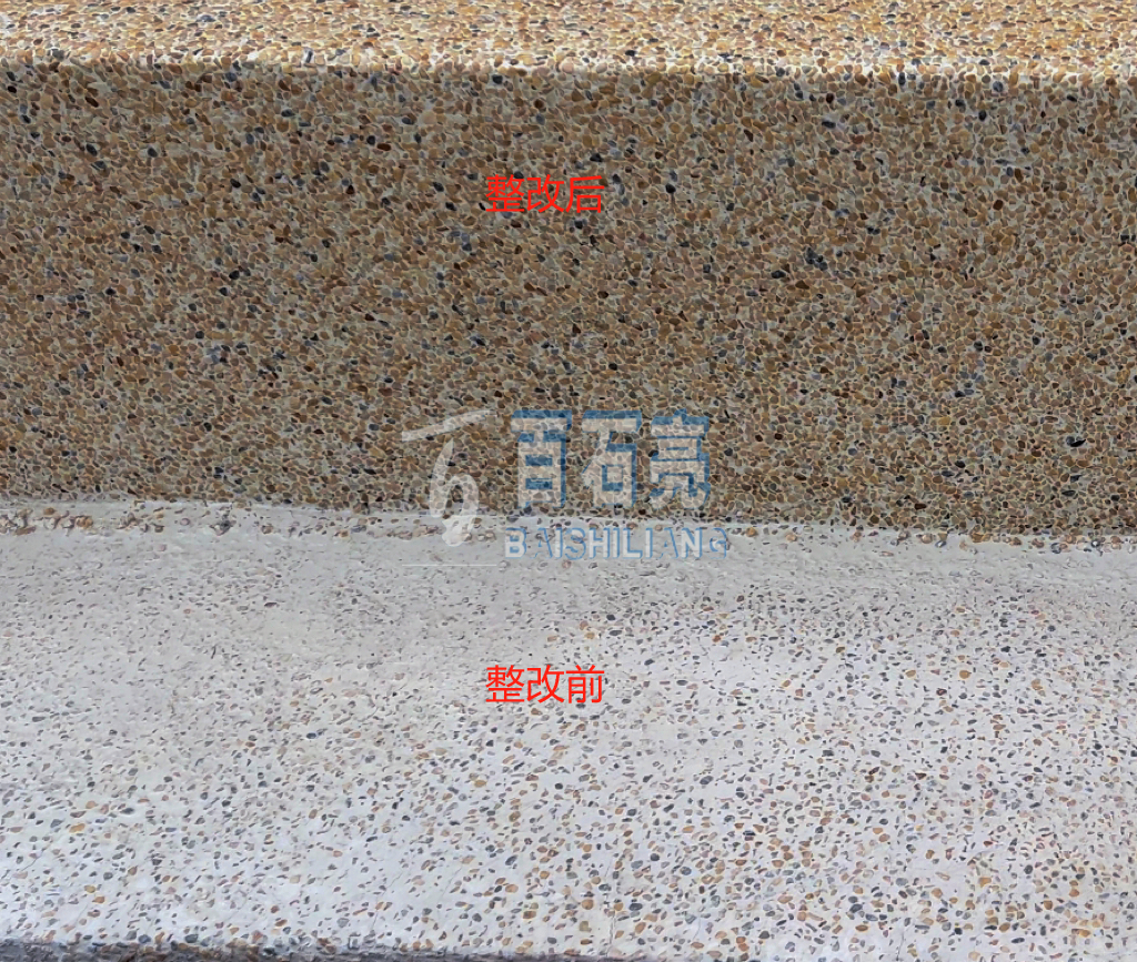 今天我?guī)Т蠹乙黄饋砜纯幢@饓艉晃豢蛻艏业那霸?,院子里的坐凳和花池都做成了水洗石的設(shè)計(jì)。起初客戶找到我們是因?yàn)樗麄冎白鏊词氖┕F(tuán)隊(duì)、將水洗石做“翻車了”于是就希望我們能夠幫忙解決一下,所以我們就來到這里,準(zhǔn)備在別人原來做好的水洗石上面再重新做一層我們的水洗石。大家可以清晰地看到整改前后的對比,別人的成品與我們成品的效果區(qū)別。