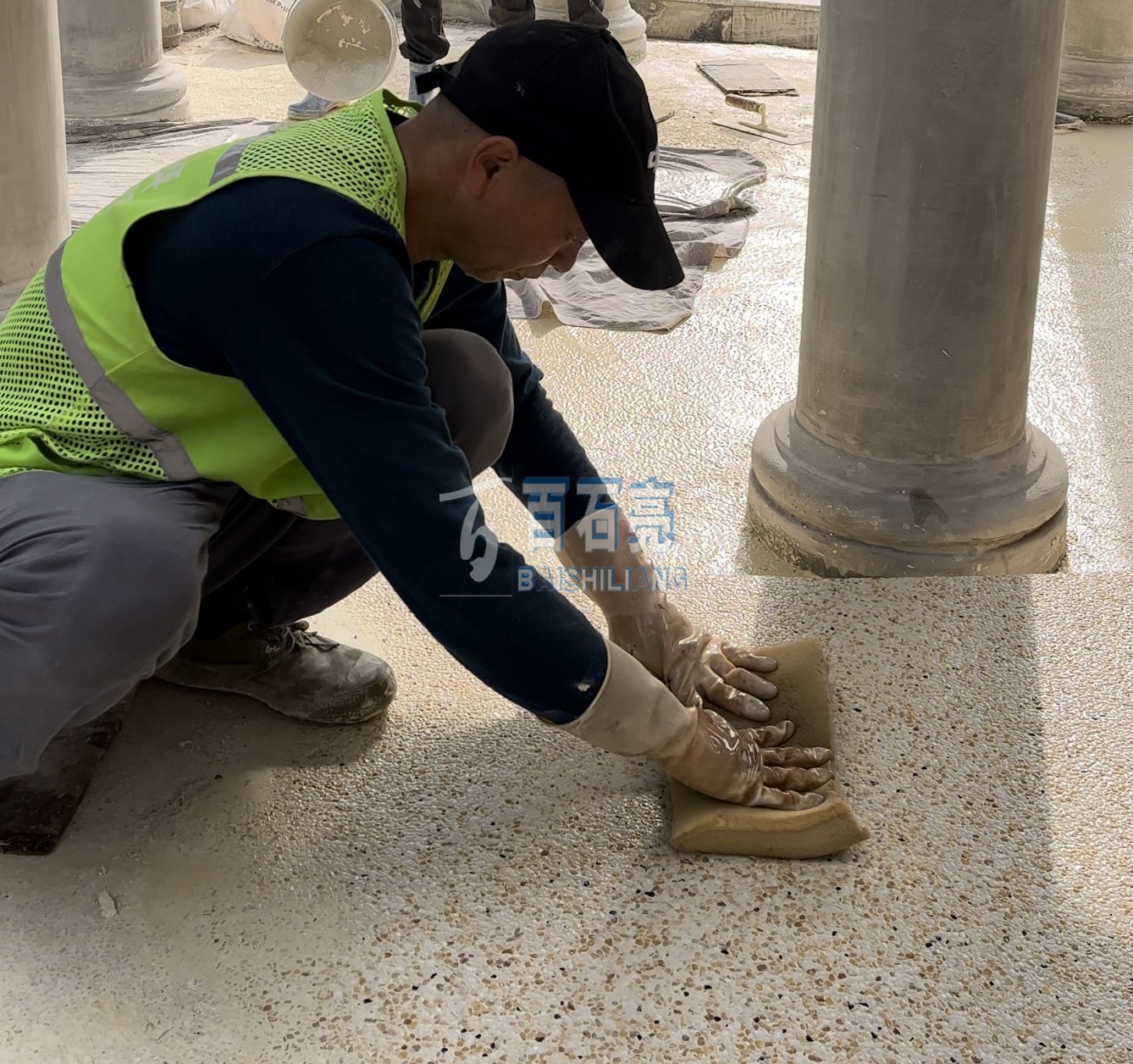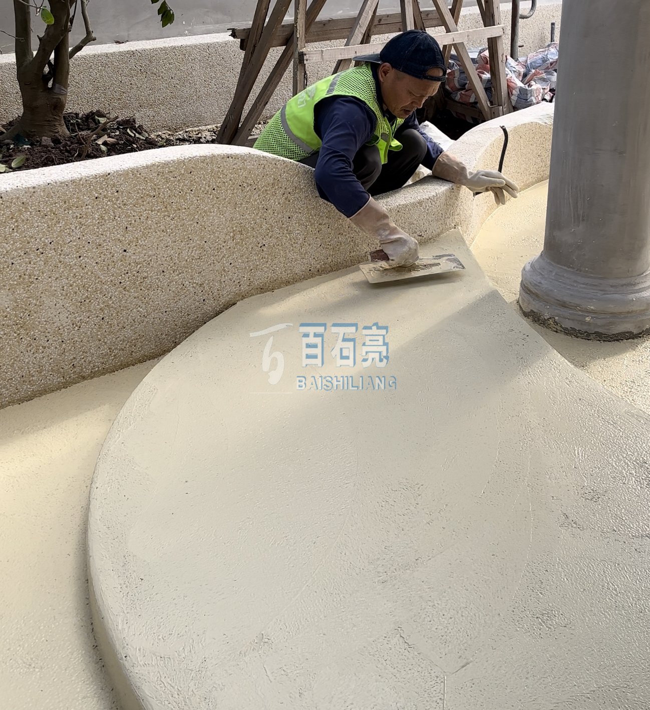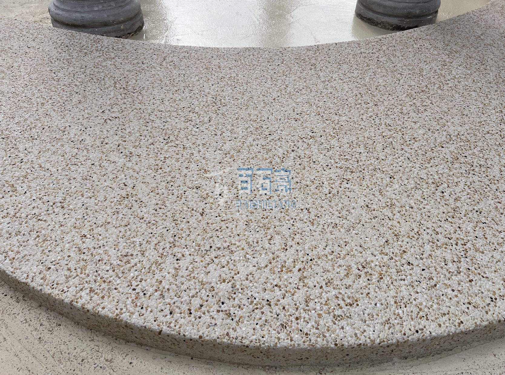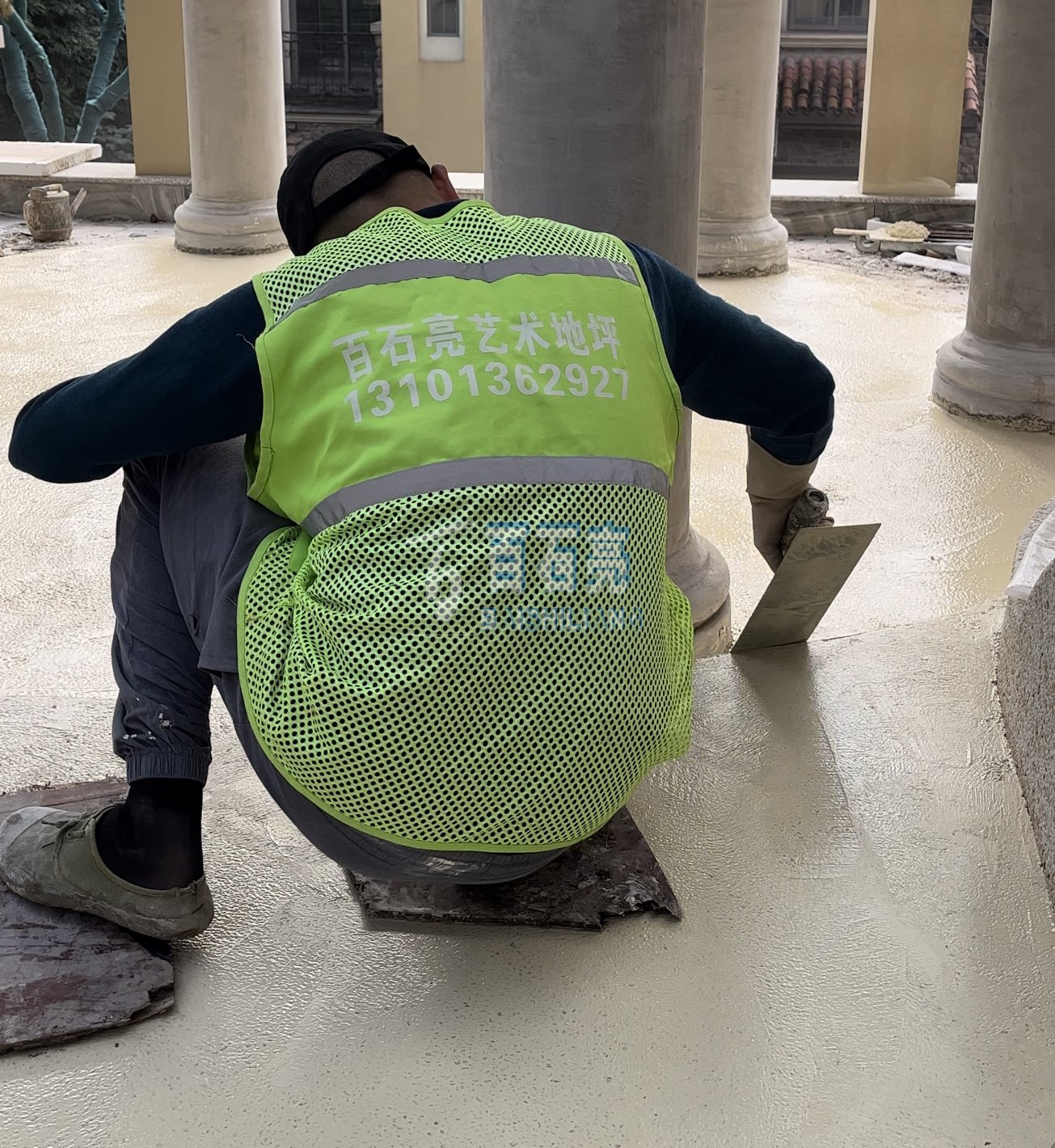 - 渝北壹江郡花園水磨石 這是一款由白色水泥加白色骨料 均勻混合而成的水磨石 用在花園地面 光滑又平整 清新自然 攤鋪 將混合均勻的水磨石材料攤鋪在地面上厚度1.5-2公分。 使用靠尺...