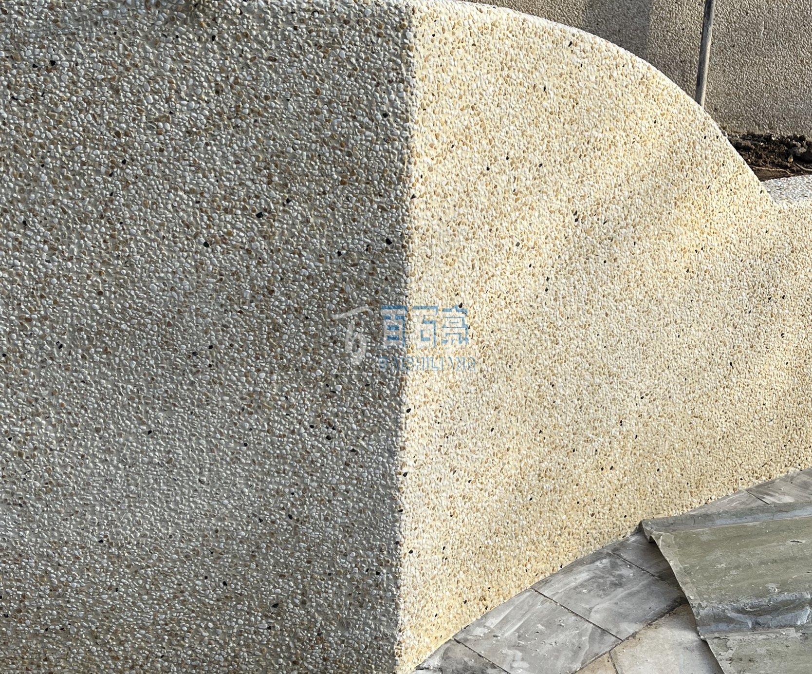 水洗石主要的施工范圍是一些花池、墻面、踢腳線、還有地面、臺面。做了一些不規(guī)則的設(shè)計(jì),有弧形,還有一些直線看起來線條豐富,很有層次感。