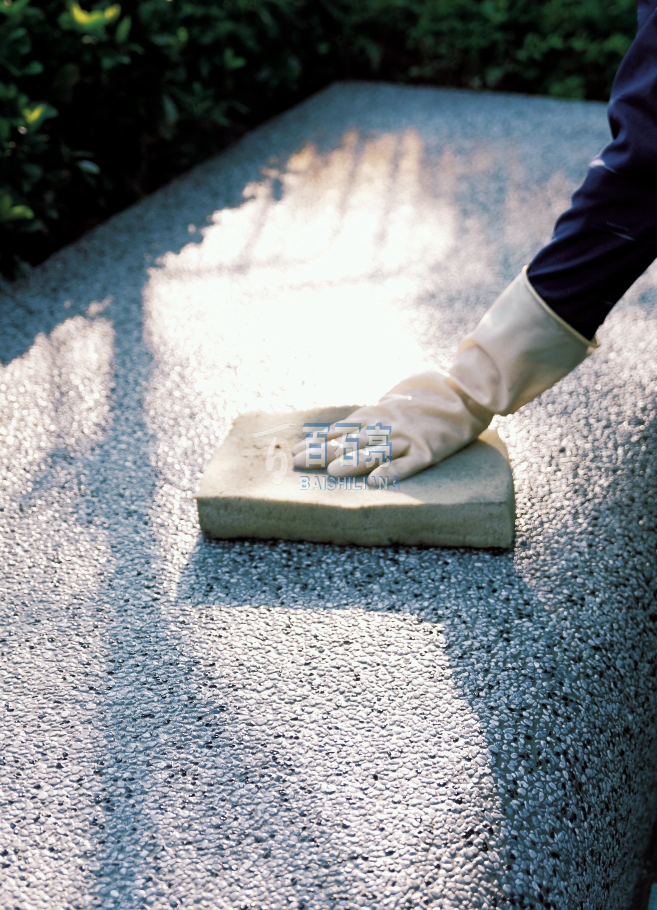 水洗石:是通過水泥和骨料混合均勻后進(jìn)行攤鋪、收平壓密實(shí),在表面快干時(shí)用水洗干凈表面的水泥漿,將骨料的2/3露出來。